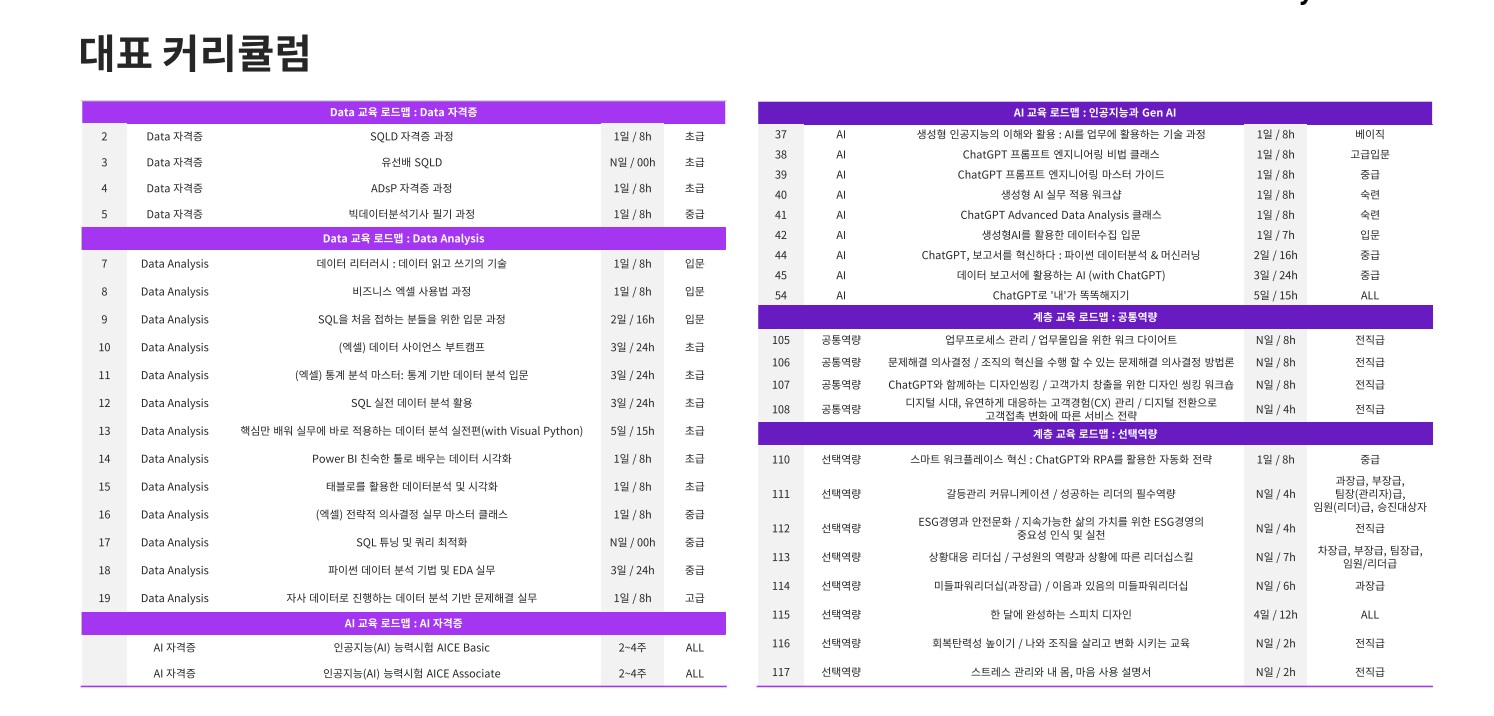 업무에 바로 활용할 수 있는 AI 활용 능력, AX 역량은 어떻게 키울 수 있을까요? ‘맞춤형 교육’을 통해 가능합니다. 현업에서 업무를 수행 중인 실무자의 다양한 상황을 고려하여 이에 걸맞게 구성한 교육이죠.