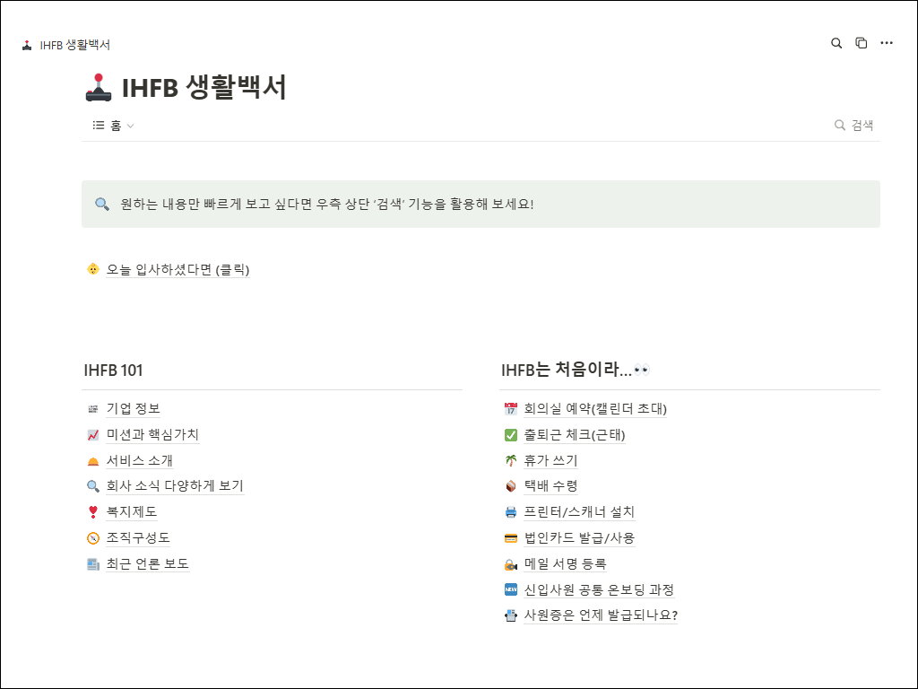 구성원이 많아질수록 정보들은 넘쳐나고, 여기저기 흩어져 존재하다 보니 필요한 정보를 제시간에 찾기가 어려워지더라고요. 저희 EX팀은 이러한 불편함을 해결하기 위해 모든 정보를 한곳에 모을 수 있는 방법을 고민했고, 그 결과 IHFB 생활백서가 탄생하게 되었습니다. 개인 메신저 창에 `생활백서?`라고 입력하면 회사 생활에 필요한 모든 정보를 한눈에 확인할 수 있는 페이지로 연결되는데요, 우리가 추구하는 '미션과 핵심 가치`부터 `분리수거 장소 안내`,`여의도 맛집 지도` 같은 실용적이고 다양한 정보들도 쉽게 찾아볼 수 있도록 구성했어요.